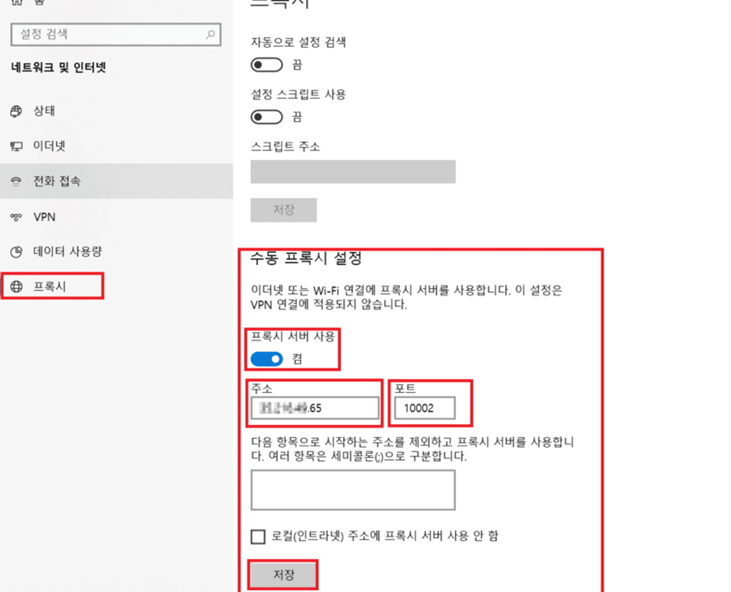 설정 → 네트워크 및 인터넷 → 프록시 → 수동 프록시 설정 에서 아이피를 넣어주고 저장